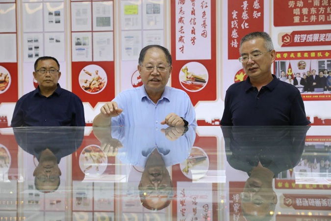 王旭峰一行参观了学校西柏坡餐厅,实地了解餐厅运行情况,随后参观了北平楼伟人塑像厅、红色藏品展厅、图书馆、百年党史馆等红色展厅。