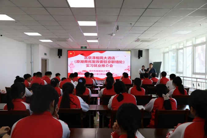 5月28日上午10:00,北京泽相苑大酒店(原湖南省发改委驻京联络处)人事部经理吴超强、邹凤到滨州市高级技工学校举行实习就业推介会。