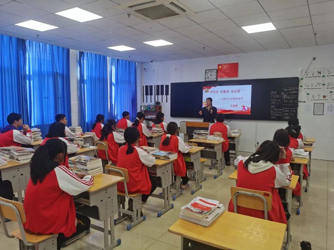 10月17日下午,在党的二十大胜利召开之际,滨州市高级技工学校领导干部利用红色思政课时间,走上讲台为学生宣讲二十大精神。
