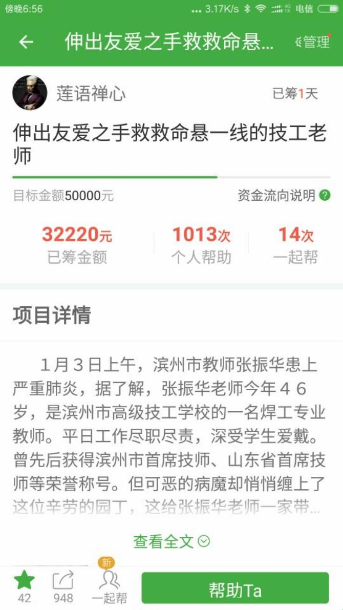 1月3日上班第一天,突然接到汽修系主任王世福的电话,我才得知张振华老师生命危在旦夕,大家都非常担心,由学校领导和学校机关工会发起了募捐活动,我在震惊中也积极捐款,学校3个小时筹集5万余元,如此惊人的筹款速度和人心凝聚力,让我为之惊奇,更多的是感动,这在类似救助募捐活动中实属罕见。我也想起平时兢兢业业的张振华老师,对工作的尽职尽责,深受学生爱戴。我感觉应该为他做点什么,平时经常上网的我想起轻松筹app,自己的信誉在微信朋友圈中传播求助信息筹款,是一种微慈善,也是我第一次做这个尝试,心里没有把握会有什么效果,但是我依然决定开始研究这个平台。建立这个众筹,需要事迹介绍、住院过程文字资料,住院证明,身份证照片,在重症监护室的照片,病危通知书、家属证明等。