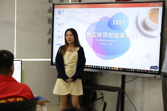 经贸管理教学中心副主任周娟介绍了“产教工坊”项目的基本情况,企业兼职教师杜传芳对本期“产教工坊”学员的表现进行了总结点评。学生代表高灏哲做汇报发言。
