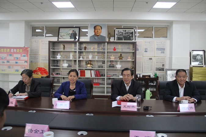 参观结束后,一行人在韶山楼二楼会议室召开座谈会,听取了王树林校长对我校红色教育办学思路的介绍。杨院长指出我校红色教育建设工作中在同类学校中具有创建性,并对做出的成绩表示肯定。杨院长强调我红色教育建设工作在职业学生的开展有其必要性,能够潜移默化的影响学生的理想、信念,让学生受益终身。最后,杨院长表示将把我校红色教育办学成果当做典型案例,放入省社科院承担的红色基因传承著作中。