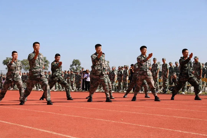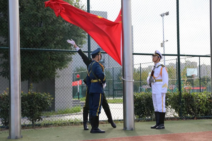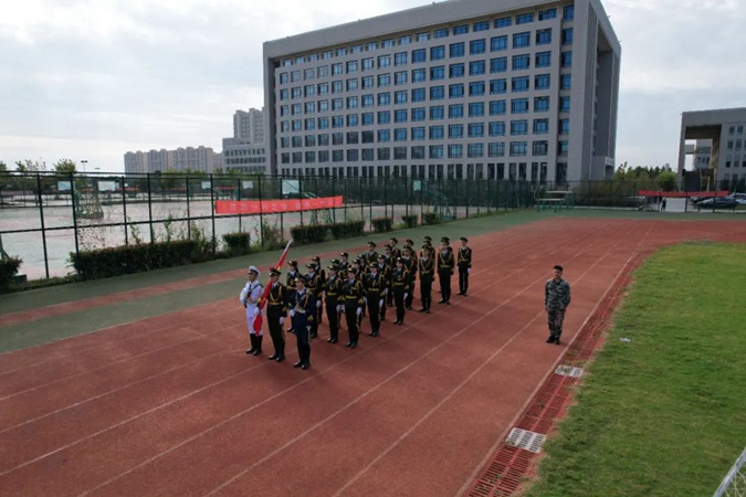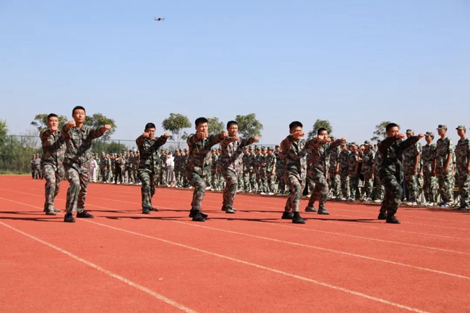 北京军为教育科技有限公司的军训教官为全体师生带来了精彩的军事演出。全体人员齐唱《歌唱祖国》,向祖国74周年华诞献礼。
