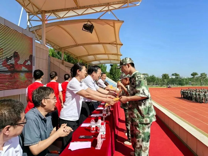 评委根据各方队的表现评选出一、二、三等奖及“军训优秀学员”。学校领导为获奖的班级和学生代表颁发奖状和证书。