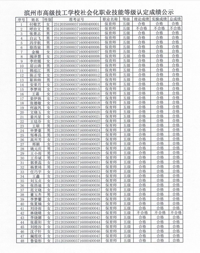 滨州市高级技工学校12月3日社会化职业技能等级认定(第三批)成绩公示