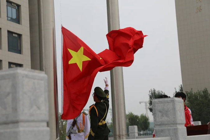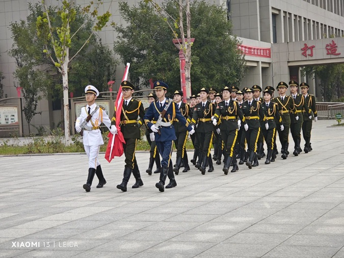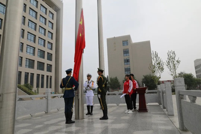 朝阳喷薄欲出,少年整齐肃立。随着一声“出旗”,国旗护卫队迈着铿锵的步伐来到了国旗台下,在激昂的《义勇军进行曲》中,全体师生高唱国歌,以意气风发的精神风貌开启新学年、新征程。