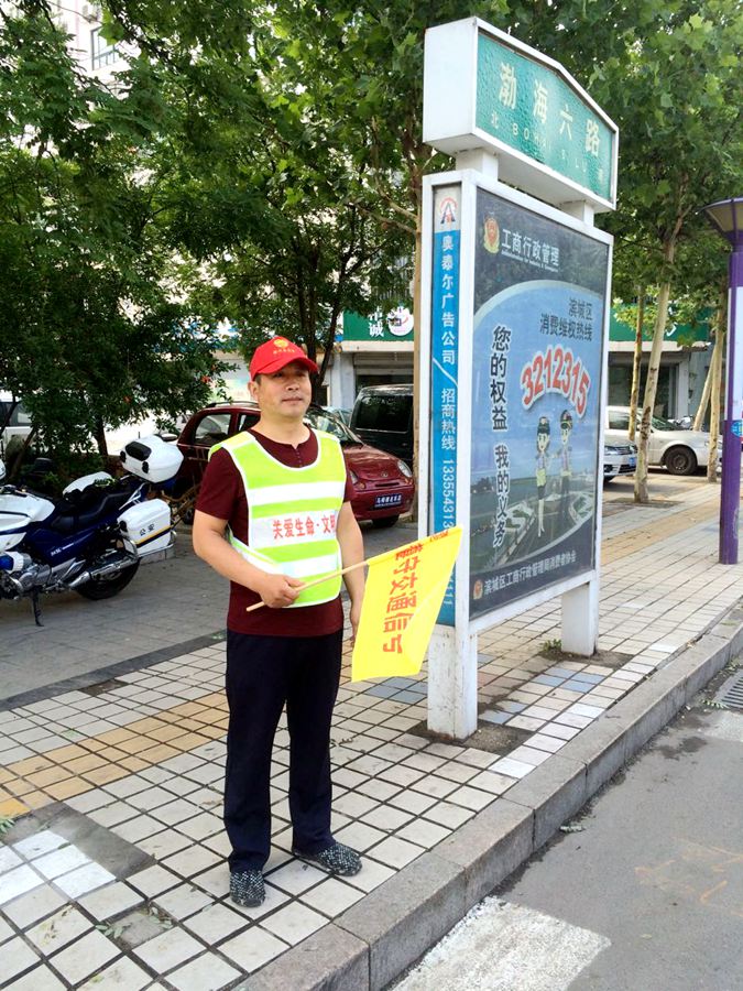 为营造文明畅通的出行环境,推动全国文明城市创建工作,根据市委市政府、区委区政府有关文件精神和创城工作要求结合学校实际,组织开展文明交通劝导志愿服务活动。我校积极响应,高度重视,制定志愿服务值日表,落实到学校值班组。自6月13日起,志愿者到滨城区黄河二路渤海六路路口进行交通执勤。