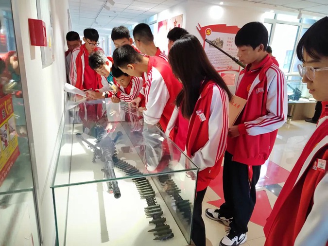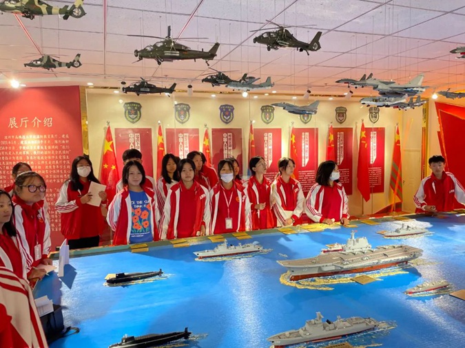 在三楼国防教育展厅,同学们参观了中国人民解放军的现代化武器装备,学习了部队发展史,了解了爱国将领、英雄战士的光荣事迹。