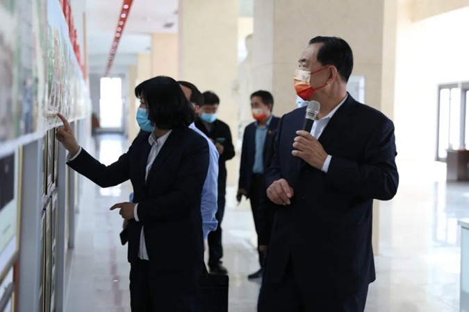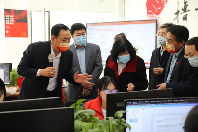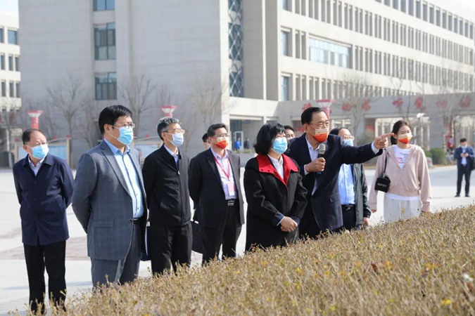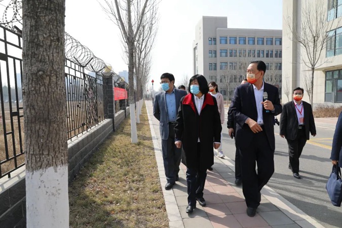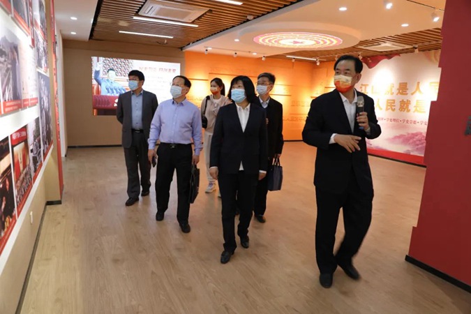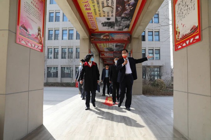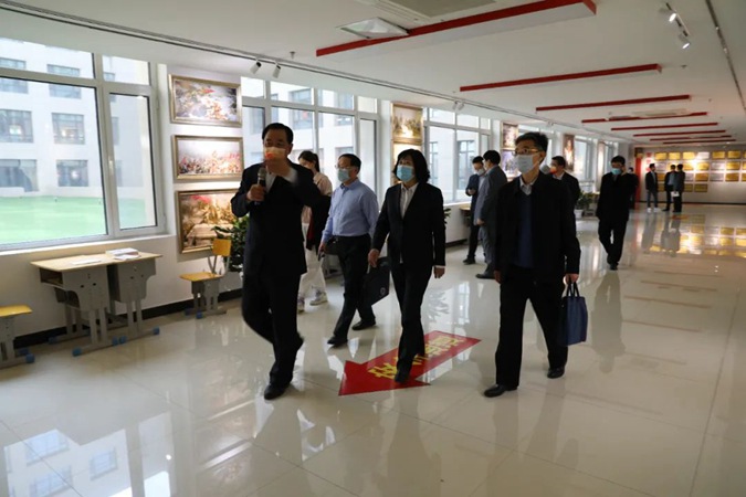 马俊昀一行参观了东方红广场、实训基地、产教工坊及各楼宇红色文化,在“南泥湾”师生劳动基地观看了学生劳动的场景,在新时代体育场为举行红色运动会的学生加油助威,与学生互动;到公寓楼实地了解学生生活情况。最后到北平楼参观了红色藏品厅、伟人塑像厅、百年党史馆等红色展厅。