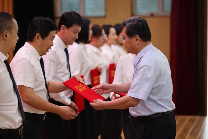 党委委员、副校长刘岳宣读《滨州市高级技工学校关于表彰2022—2023学年度第二学期先进科室、先进教学中心部、优秀教师、先进工作者等的决定》,校领导上台为获奖代表颁奖。