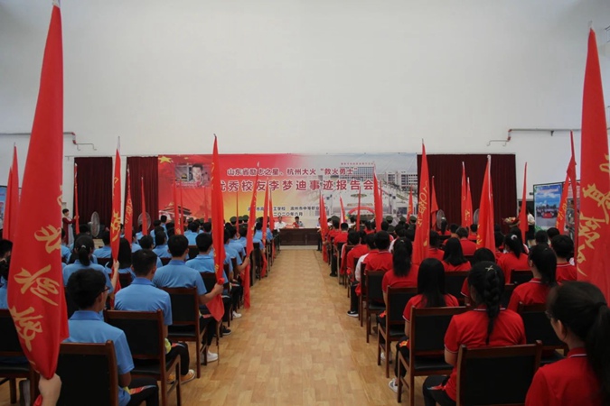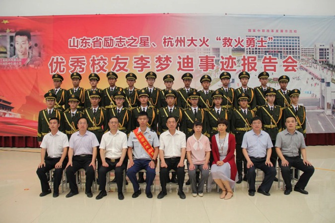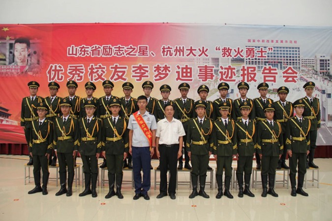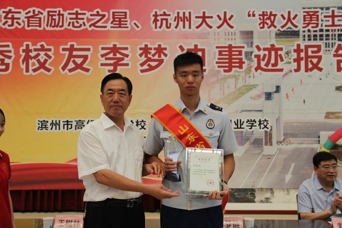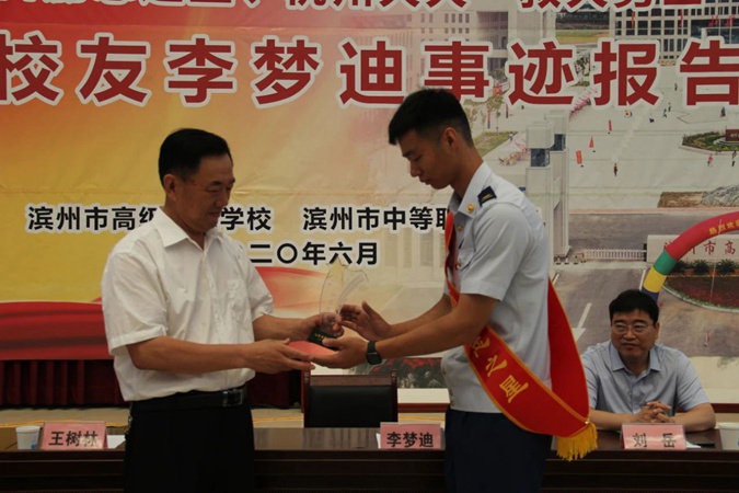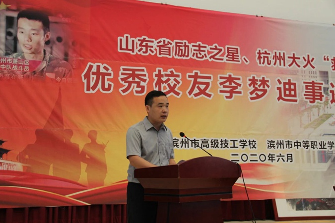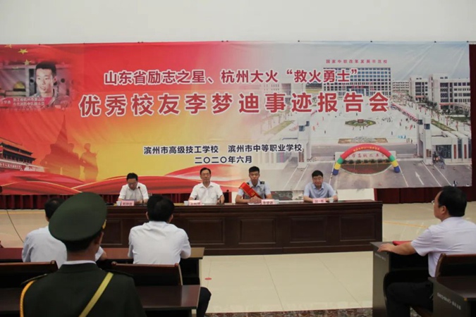 2020年6月21日上午,滨州市高级技工学校在南昌楼一楼大厅隆重举行山东省励志之星、杭州大火“救火勇士”、优秀校友李梦迪事迹报告会。学校党委书记、校长王树林,党委委员、副校长刘仲凯,党委委员、副校长刘岳,各科室、教学中心(部)主要负责人,全体班主任,学校国旗班全体同学,部分学生代表参加。报告会由刘仲凯主持。