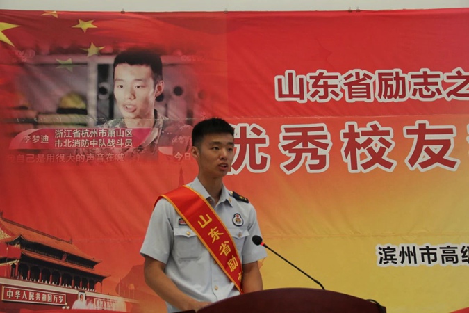 随后,李梦迪做事迹报告。他与现场同学分享了自己的成长历程,详细讲述了在2018年7月21日杭州萧山区时代广场救火行动中成功救出3名被困人员的经过。通过自己的成长经历说明了学校红色教育对学生成长的重要意义,表达了对学校培养的感激之情。最后对全体同学提出殷切希望,为学校发展送上美好的祝愿。