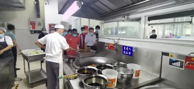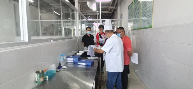 全体人员对餐厅清洗间、操作间、消毒间、库房、售卖间的环境及相关设备设施进行了详细查看,对食品原材料的采购、验收、保管、加工、储存、烹饪、留样、售卖等各环节情况进行了全面了解。重点检查了从业人员健康状况和培训管理、食品留样管理、原材料采购、餐厨垃圾处理等情况。