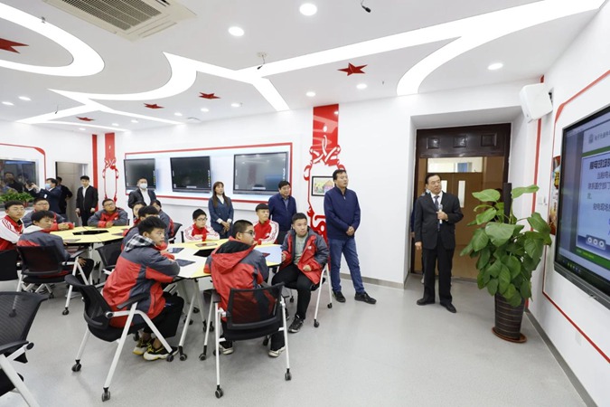 王腾香一行参观了学校渤海革命老区红色教育基地,实地感受学校浓郁的红色育人氛围;走进教室和学生餐厅,了解学生学习和生活情况,对口交流学生管理经验。随后,在北平楼一楼报告厅观看了学校宣传片。