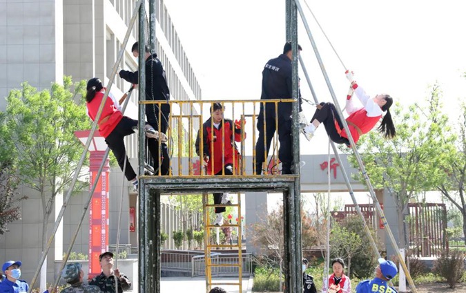 应急疏散演练结束后,全体学生利用4月14日、4月15日两天时间进行了体验式安全教育。在滨州市安全教育学校教官的带领下,分别进行了楼房下滑逃生、火海逃生、烟雾逃生、心肺复苏、简易担架的制作与伤员搬运、伤员包扎(紧急救护)、地震避险等安全项目的体验。