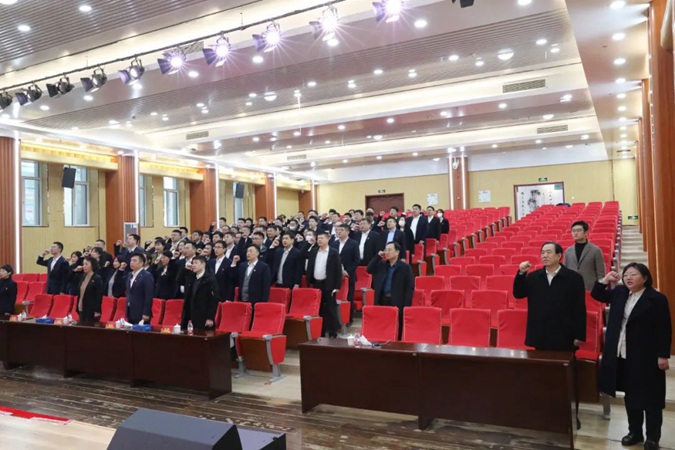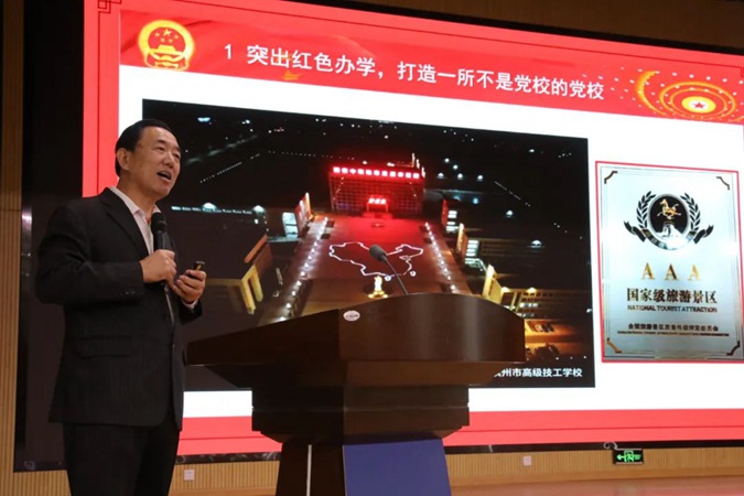参观结束后,全体党员在一楼报告厅重温入党誓词,砥砺入党初心。随后,王树林为全体人员做红色教育报告。他以《让红色精神永放光芒》为题,讲述了习近平新时代中国特色社会主义思想与毛泽东执政理念一脉相承,通过生动的故事、经典的史实、形象的描述,解读了中国共产党人的初心和使命,讴歌了党的光辉业绩和伟大理想;并从“六个突出、六个没发生、四个没想到、培育五爱五自三能的社会主义建设者”等方面介绍了滨州市高级技工学校通过红色办学实现高质量发展的经验做法。