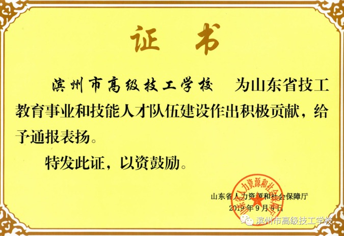 11月20日,我校受到山东省人力资源和社会保障厅通报表扬,表彰学校为全省技工教育事业和技能人才队伍建设作出的积极贡献。年内,还获多项省级荣誉:山东省卫生先进单位、山东省理论宣讲基地、山东省中等职业学校优秀学生、山东省中等职业学校先进班集体、山东省科普教育基地、齐鲁首席技师、2020年山东省“技能兴鲁”职业技能大赛第四届山东省虚拟现实与创新产业应用竞赛优秀组织奖、山东省产教融合示范单位(基地)、 山东省社会科学普及教育基地等荣誉称号。