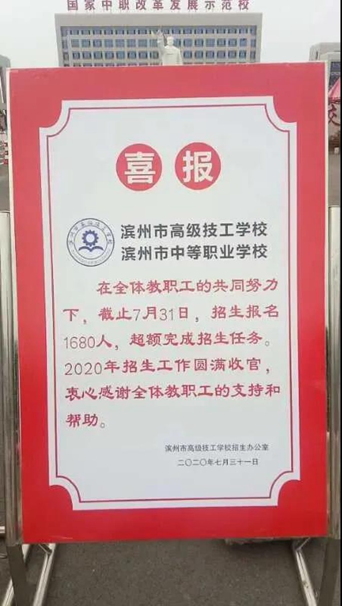 2016年滨州市高级技工学校在校生1156人,2020年学校招生1680人,在校生达到4000人,是2016年的3.6倍。2020年学生实习就业洽谈会上,滨州中裕食品有限公司、山东滨能电力集团等本市企业及澳柯玛集团、海信日立空调系统有限公司、上汽通用五菱汽车股份有限公司等企业,提供10多个专业、1000余个工作岗位,毕业生不到一个小时全部签约中意岗位。学校还与国家发改委、京西宾馆等单位签订毕业生就业战略合作协议。2020年,44人参加春季高考和天师考试,本科上线17人,上线率39%,是全省平均本科上线率(24.1%)的1.6倍。
