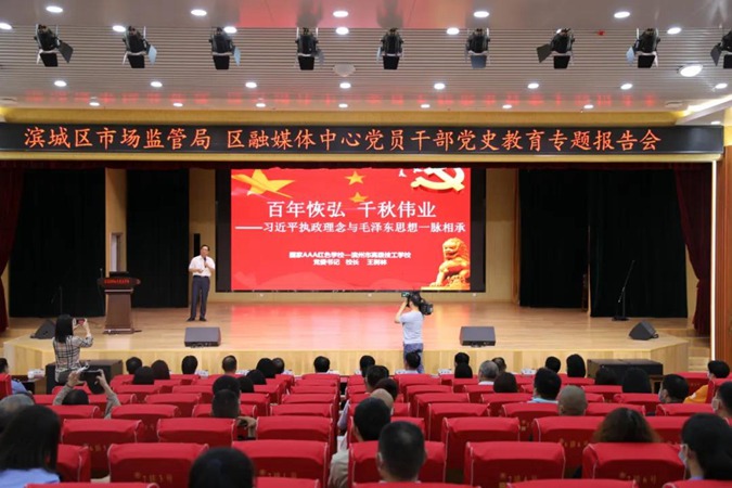 参观结束后,全体人员在北平楼报告厅聆听了滨州市高级技工学校党委书记、校长王树林的党史教育专题报告会。王树林以《百年恢弘 千秋伟业》为题,通过经典的史实、生动的故事、形象的描述,重现了建党百年的光辉历程,激励大家不忘初心,砥砺奋进。