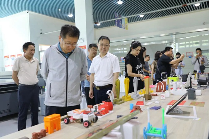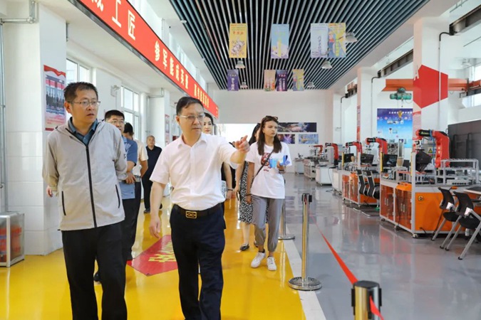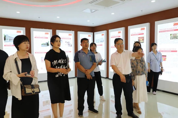 朱元亮一行参观了东方红广场 、嘉兴楼实训中心;经红色连廊,到井冈山楼现场参观了校企合作项目“产教工坊”、京东直播实训室;经“南泥湾”师生劳动基地,到北平楼参观了廉政文化作品展、伟人塑像厅、红色藏品展厅、红色图书馆、百年党史馆、校史馆等红色展厅。