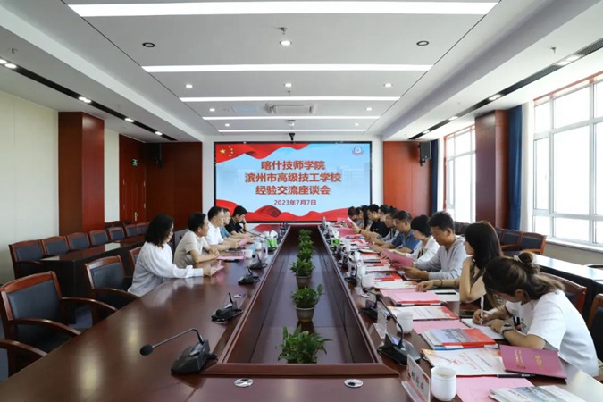 座谈会上,刘仲凯代表滨州市高级技工学校对喀什技师学院领导的到访表示欢迎,并介绍了学校办学情况及近年来的发展变化。朱元亮介绍了喀什技师学院的基本情况,对学校红色办学及取得的成绩给予高度评价,对援疆教师毛岳军的工作给予充分肯定。双方围绕党建、校园文化建设、共青团、专业建设等工作进行了深入交流,希望能够加强合作,共同探讨职业教育高质量发展之路。