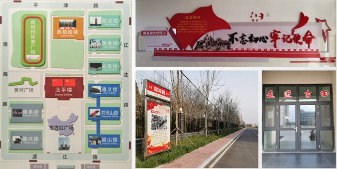 新校广场命名东方红广场。广场中间是大理石铺成的巨幅中国地图。地图最南段——曾母暗沙处,屹立一尊毛主席雕像。为弘扬革命精神,校园10座建筑物均以革命纪念地来命名(韶山楼、延安楼),每个班级以一位革命先烈及英雄、英模命名(雷锋班、刘胡兰班),主要道路都冠以重大革命战役名称(淮海路、渡江路)。