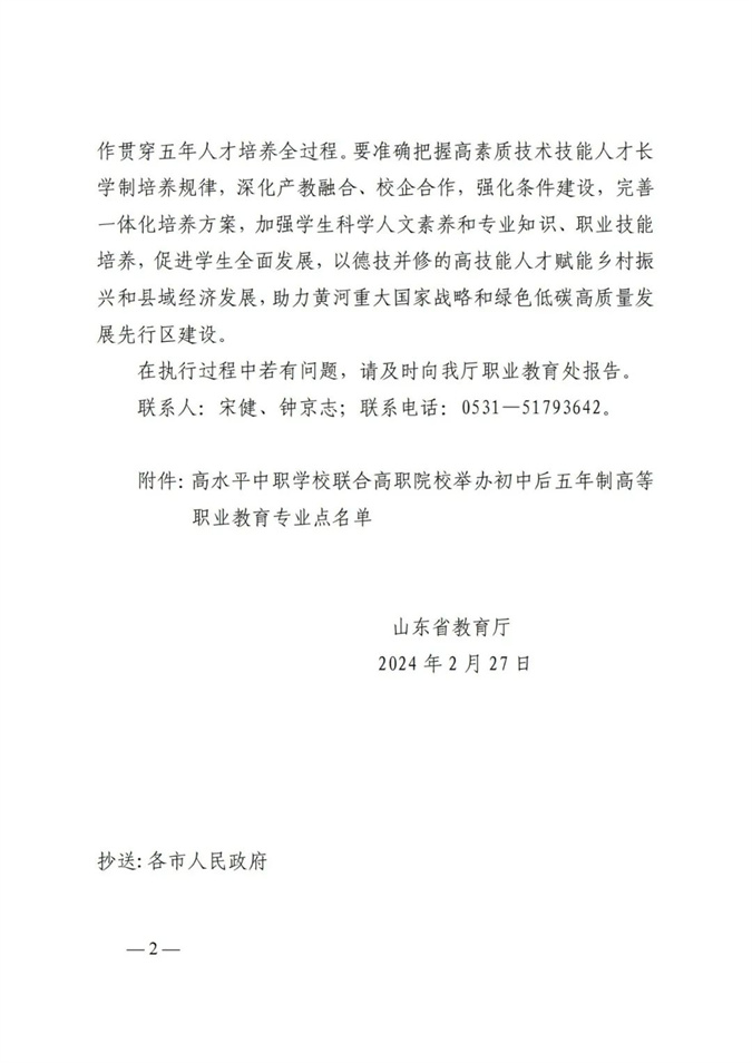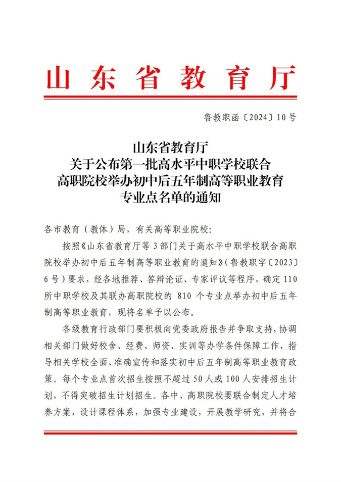 滨州市中等职业学校(滨州市高级技工学校)七个专业举办初中后五年制高职获山东省教育厅批准