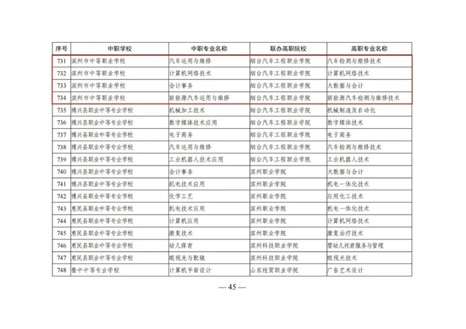 滨州市中等职业学校的机电技术应用、电子商务和数控技术应用3个专业与滨州职业学院联合办学,汽车运用与维修、计算机网络技术、会计事务、新能源汽车运用与维修4个专业与烟台汽车工程职业学院联合办学。