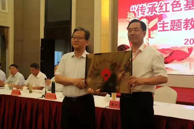 ▲山东省关工委常务副主任、山东省人大原副主任崔曰臣现场授予滨州市高级技工学校“山东省关心下一代教育基地”荣誉
