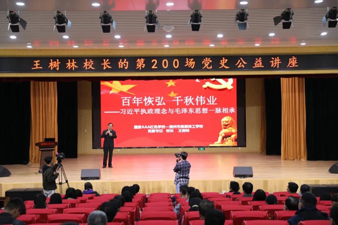 王树林校长本人作为全国毛泽东思想研究会会员,德育圈智库专家、山东省职业与职工教育领军人物、山东省职业技术教育学会“课程思政与思政课程”研究分会副会长,悉心研究毛泽东思想和习近平新时代中国特色社会主义思想。其《习近平执政理念与毛泽东思想一脉相承》等研究成果,在各地宣讲,讲到新华社,清华大学,山东省委大院、党政机关、企事业单位、街道社区、大中小院校等,对外作报告230场,受教育者超过1.6万人次。王树林校长作为改革先锋人物,其先进事迹荣登《中央电视台》发现之旅《聚焦先锋榜》、《中华英才》、《教育家》、《学习强国》等。