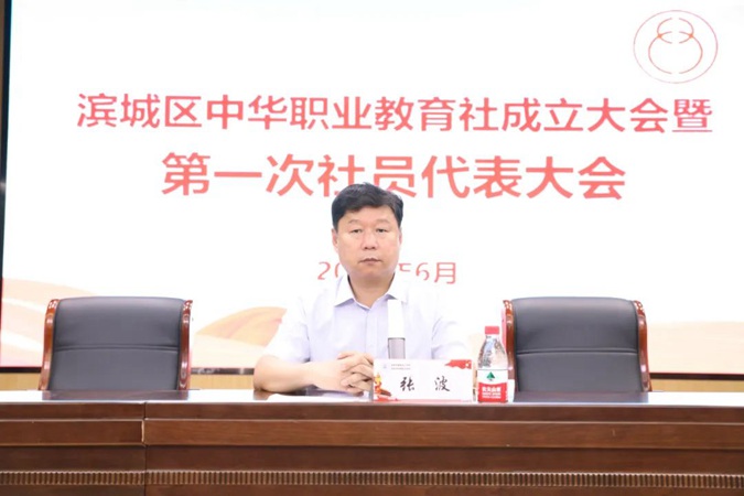 区委组织部副部长、区委编办主任张波宣读中共滨城区委《关于设立滨城区中华职业教育社的通知》、区委编办《关于明确滨城区中华职业教育社领导职数等机构编制事项的通知》