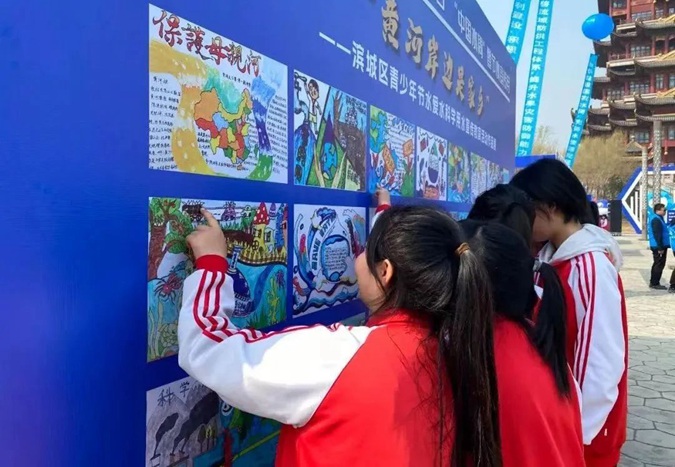 启动仪式结束后,学生志愿者在工作人员的引导下参观了节水宣传展板。