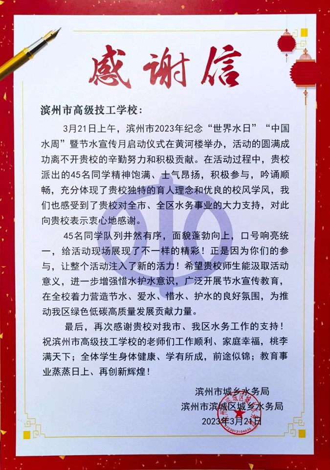滨州市城乡水务局、滨城区城乡水务局为滨州市高级技工学校写来感谢信,表示在活动过程中,学校学生志愿者精神饱满,士气昂扬,积极参与,吟诵顺畅,充分体现了学校独特的育人理念和优良的校风学风。