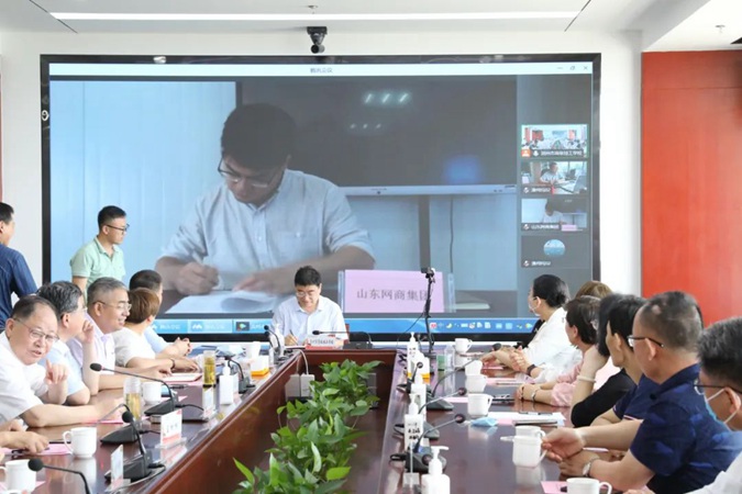 最后,刘岳代表学校分别与澳柯玛集团、山东网商教育科技集团以远程视频连线的方式进行“线上”签约,与出席仪式的企业进行现场签约,与会领导见证签约过程。