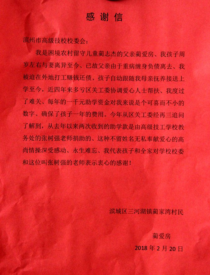 3月28日,我校收到一份感谢信和一面锦旗。感谢信是三河湖蔺家湾村村民蔺爱房写的,蔺先生离异,父亲重病缠身负债离去,家境贫困,孩子跟随其母亲,自己外出打工。