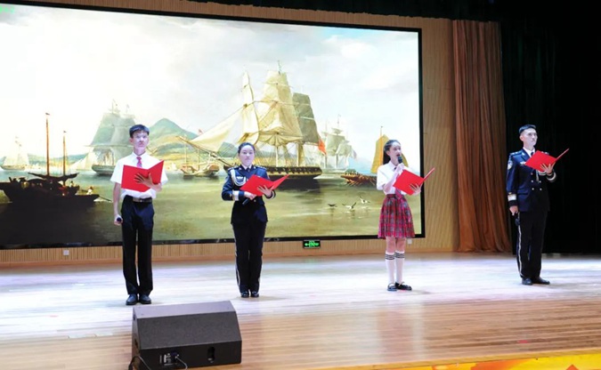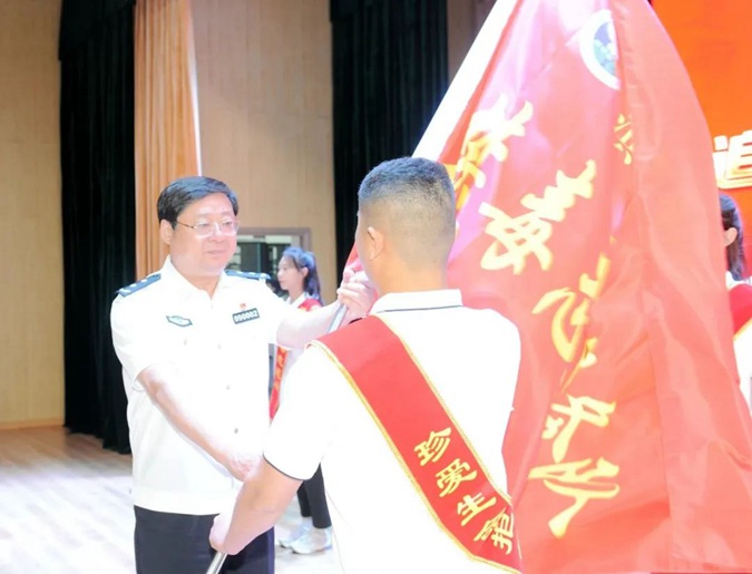 随后,全体人员来到学校北平楼报告厅,郑玉梅、李刚分别致辞,周海林为滨州市高级技工学校禁毒志愿宣传队授旗,学校禁毒宣传志愿服务队代表进行庄严宣誓。