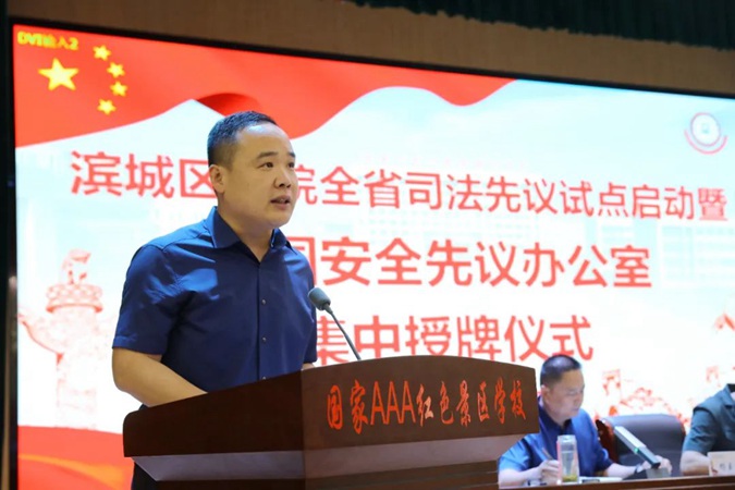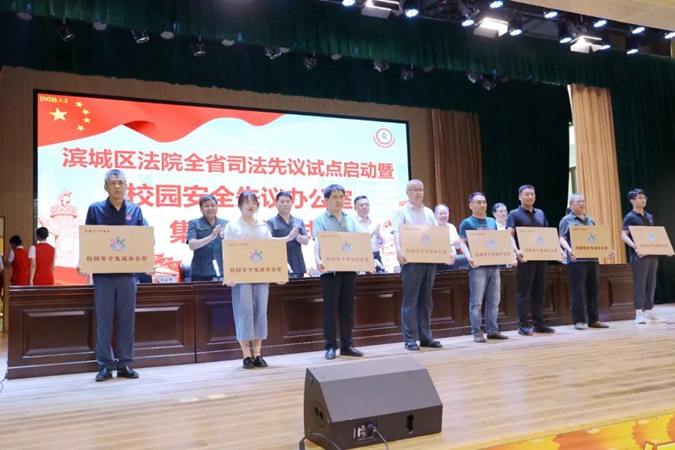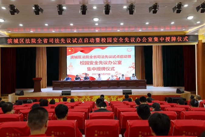 为预防青少年违法犯罪,促进平安校园、法治校园建设,全面加强未成年人权益司法保护,5月29日,滨城区人民法院在滨州市高级技工学校举行了全省司法先议试点启动暨校园安全先议办公室集体授牌仪式。滨州中院副院长孔宪军,滨城区法院党组书记、院长扈炳刚出席仪式并讲话。滨州中院少审庭庭长李然深,滨州市高级技工学校党委副书记、副校长孟维赞,党委委员、副校长刘仲凯,滨城区教体局党组成员、总督学刘鹏飞等出席仪式,滨城区委政法委副书记杨玉峰主持。