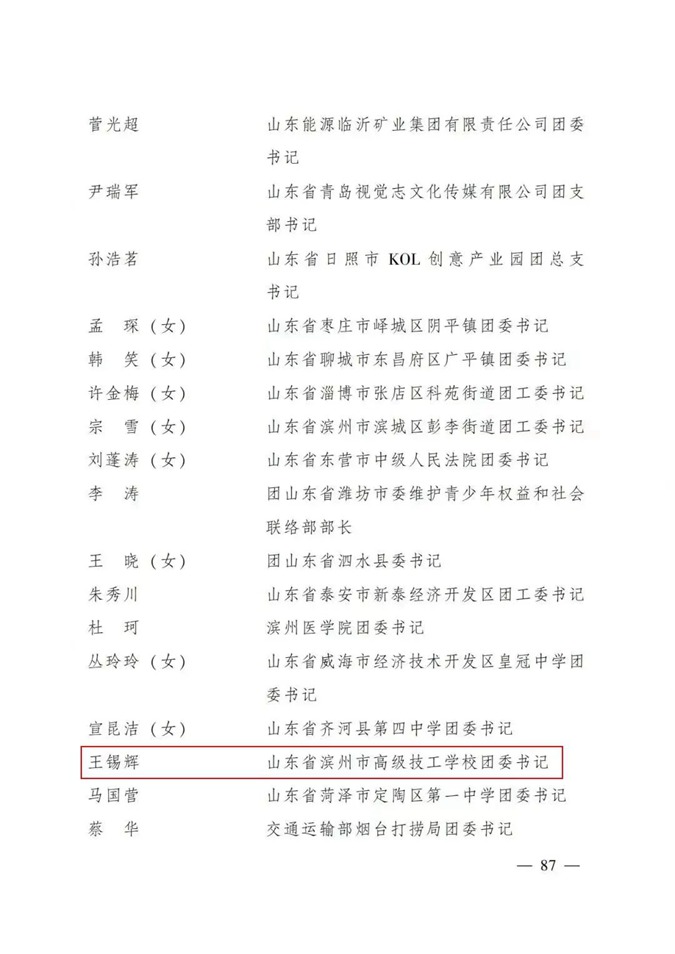 近日,全国“两红两优”评选结果揭晓,滨州市高级技工学校团委书记王锡辉荣获全国优秀共青团干部称号。