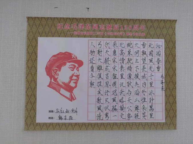 学校语文教研组组织举行了《毛泽东诗词》硬笔书法比赛,全校师生共同参与,最终评选出60余幅优秀作品,在北平楼二楼展厅展出。一幅幅作品匠心独运、各具特色,有的婉约流畅、端庄秀丽,有的刚健遒劲、孔武有力,既展现了学校师生的风采,又体现了对伟大领袖的缅怀之情。
