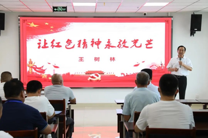 参观结束后,在北平楼三楼会议室,王树林为全体人员讲党课。他以《让红色精神永放光芒》为题,从渡江小英雄马毛姐的感人事迹讲到习近平新时代中国特色社会主义思想与毛泽东执政理念一脉相承,通过生动的故事、经典的史实、形象的描述,解读了中国共产党人的初心和使命,讴歌了党的光辉业绩和伟大理想。