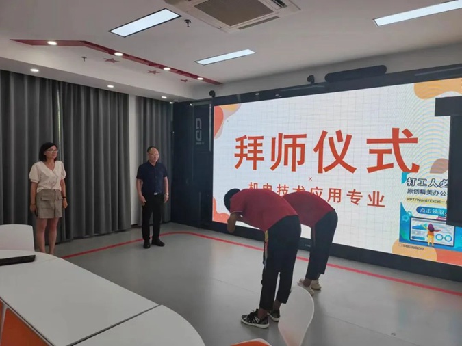 6月29日邀请滨州首建科技有限公司刘荟英和梅凤月讲师、山东惠鲁检测服务有限公司张国庆总经理到校参加2021级就业班企业导师拜师仪式。