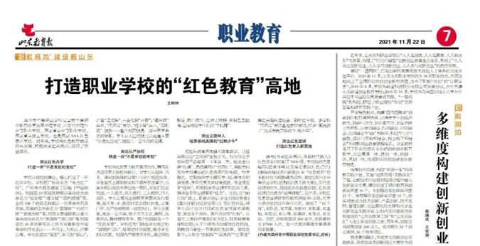 11月22日,山东教育报刊载滨州市中等职业学校(滨州市高级技工学校)党委书记、校长王树林的署名文章《打造职业学校的“红色教育”高地》。
