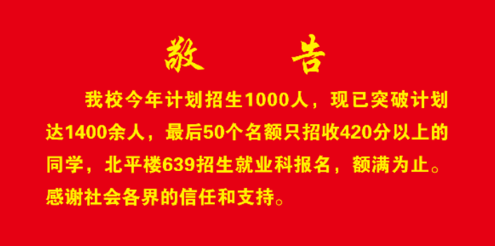 我校今年计划招生1000人,现已突破计划达1400余人,最后50个名额只招收420分以上的同学,北平楼639招生就业科报名,额满为止感谢社会各界的信任和支持。