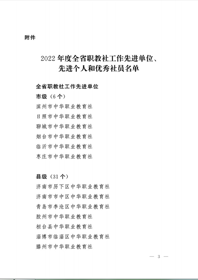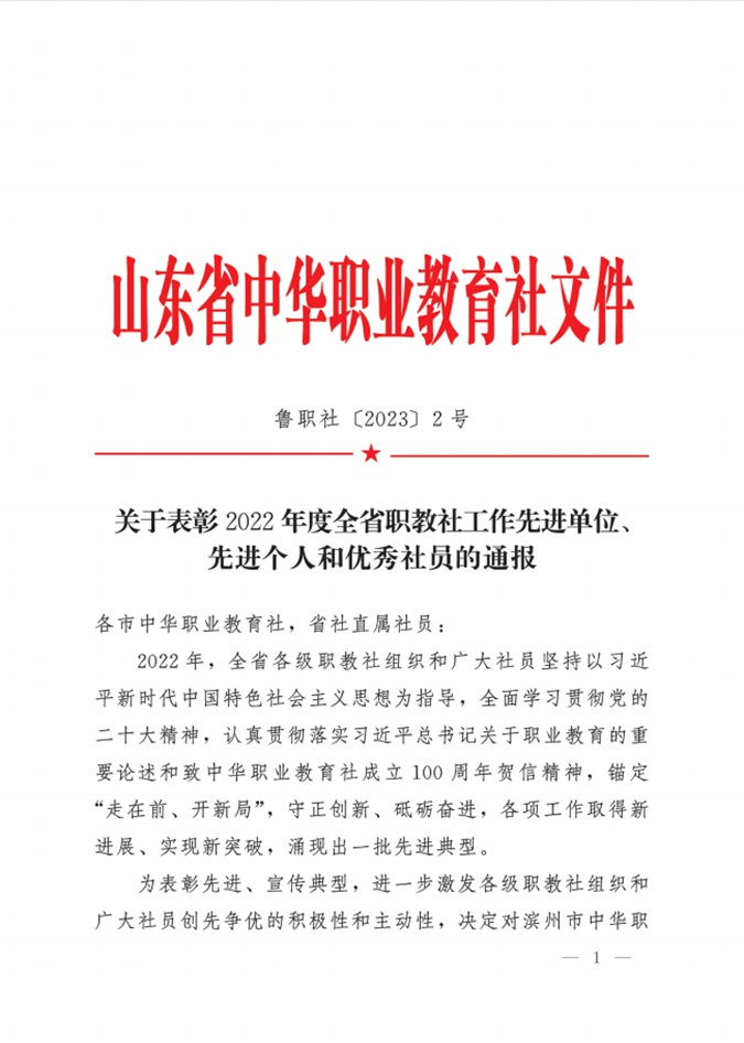 近日,山东省中华职业教育社文件印发《关于表彰2022年度全省职教社工作先进单位、先进个人和优秀社员的通报》,滨州市高级技工学校党委书记、校长王树林荣获“山东省中华职教社优秀个人社员”称号。
