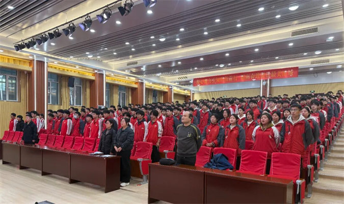 大会在庄严的国歌声中拉开序幕。全体师生肃立致敬,嘹亮的歌声响彻报告厅,爱国情怀在旋律中激荡,奋进信念在心底扎根。