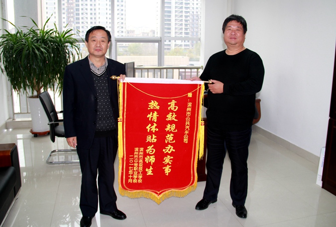 11月9日上午,我校办公室主任杜湖亭代表学校向滨州市公共汽车公司赠送锦旗,感谢对学校师生交通出行给予的大力支持和帮助,市公共汽车公司副总经理范利眀代表公司接收锦旗。