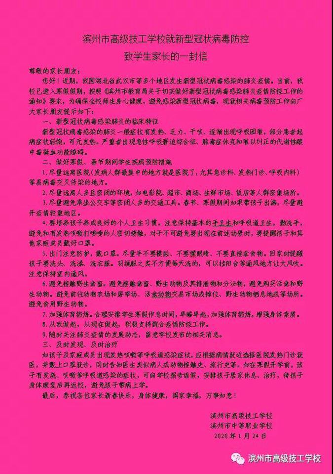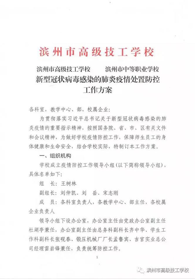 防控疫情,刻不容缓,滨州市高级技工学校全体领导和教职员工将同心同行,众志成城,以高度的责任心,以最坚决的态度、最严格的措施、最果断的行动,坚决打赢疫情防控攻坚战!