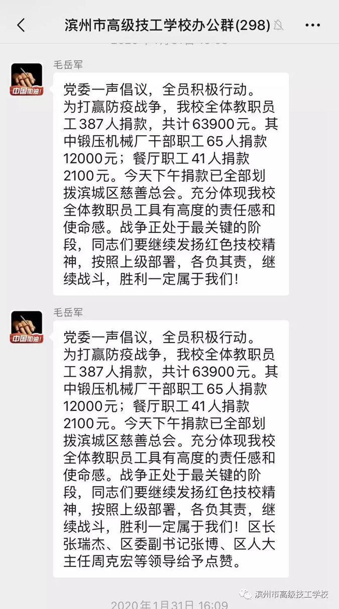 第一时间组织全校上下干部职工为防控疫情捐款63900元,并上缴区慈善总会。