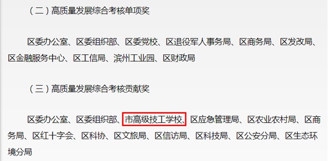 近日,2021年度滨城区高质量发展综合考核结果公示,滨州市高级技工学校以事业单位第一名的成绩,再次获得区直部门(单位)高质量发展综合考核优秀等次,并且作为唯一的事业单位荣获高质量发展综合考核贡献奖。