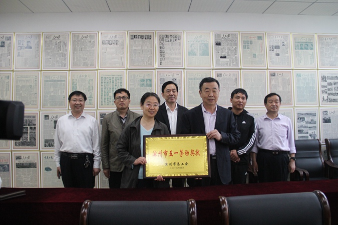 在国际劳动节到来之际,滨州市总工会发文表彰关于表彰滨州市2018年“五一”劳动奖章和奖状的先进个人和集体,我校荣获“五一劳动奖状”殊荣。5月1日上午,在新校办公楼二楼会议室隆重举行了“五一劳动奖状”授牌仪式,滨城区总工会副主席尚建军等领导应邀出席会议并为我校授牌。校长王树林、副书记史文莲及学校部分领导干部参加了会议。会议由王树林校长主持。